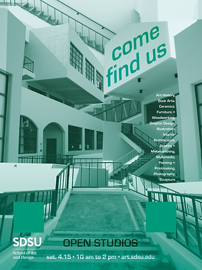 The SDSU School of Art and Design requested the Design Studio class to develop multiple solutions to promote their Open Studios event in the Spring. The concept for this design was to utilize the School of Art and Design’s key architectural features in a playful manner to mimic the confusing nature of the building for newcomers. To properly convey the confusion of navigating the school, I took and collaged together photos to create playful distortions of space that are still recognizable as the School of Art and Design’s architecture.
