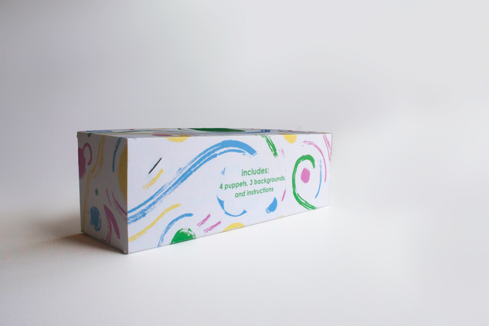 The puppets, backgrounds, and other elements were designed with a childlike concept of wonder. Each artwork/element has rough edges, texture, bright colors, and simple but cute artwork to appeal to any child. For the main packaging, only 4 colors were used: pink, yellow, green, and blue. The colors are playful in their appeal to children. Each of the puppets were made by hand using construction paper and foam. The packaging includes instructions on how to assemble each puppet and play with the box.